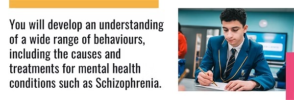 You will develop an understanding of a wide range of behaviours, including the causes and treatments for mental health conditions such as Schizophrenia.
